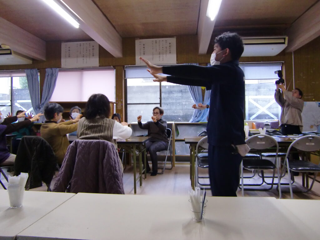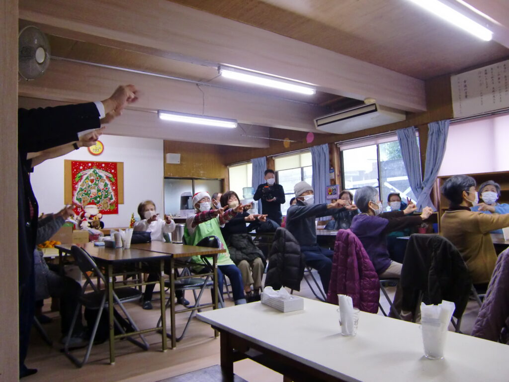 最初はいつも通り、ライフケアガーデン熱川の理学療法士によるラジオ体操や「100歳体操」を行い、参加者の皆さんと一緒に無理のない範囲で身体を動かしました。体操のあとは、当院スタッフが担当し、運動機能と認知機能の両方を同時に鍛える「コグニサイズ」を実施しました。今回は、ジャンケンの「グー・チョキ・パー」を使った運動を行い、両手を前に出して掛け声に合わせて手の動きを連続で行ったり、速さを変えたりしました。また、「後だしジャンケン」では、スタッフが出した手に必ず後出しで勝つように考えながら手を動かす内容で、頭と体を同時に使う良い運動となりました。参加者の皆さんも楽しみながら積極的に取り組まれていました。