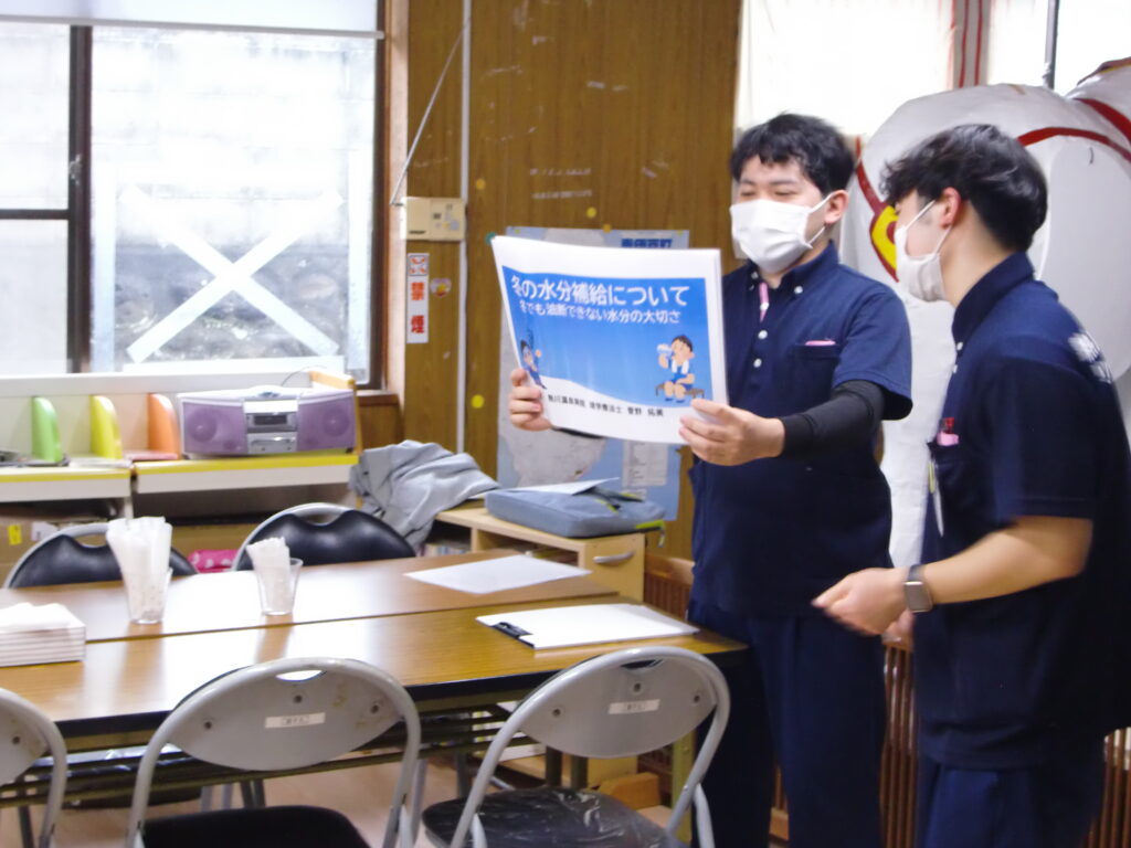 最後には、「冬場の水分摂取の重要性」についてお話をしました。夏場と違い、寒い時期は喉の渇きを感じにくく、水分補給を忘れがちになりますが、喉が渇いたと感じた時にはすでに水分が不足している可能性があるそうです。特に、起床時・入浴前後・運動時・就寝前は意識して水分を摂ることが大切とのことでした。